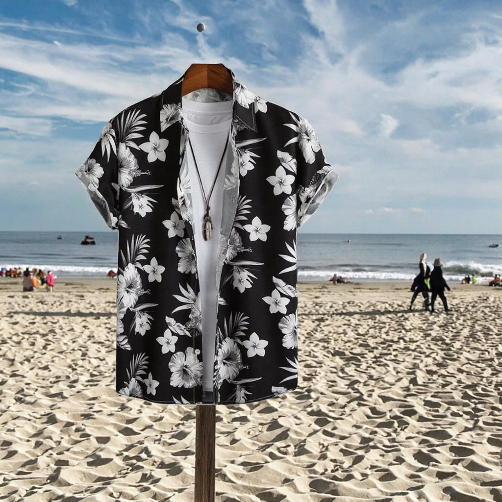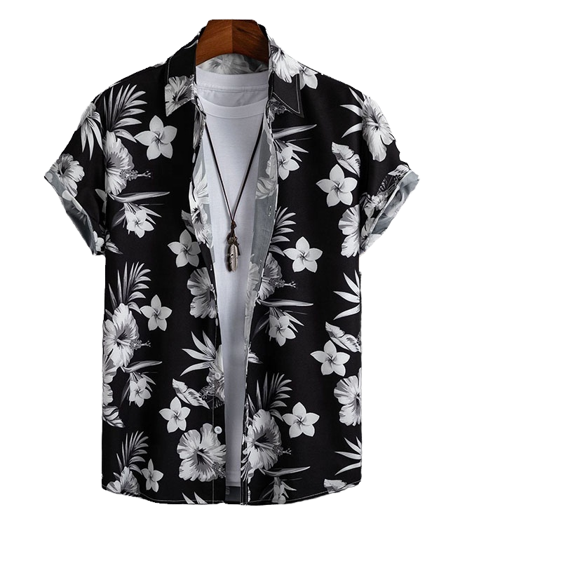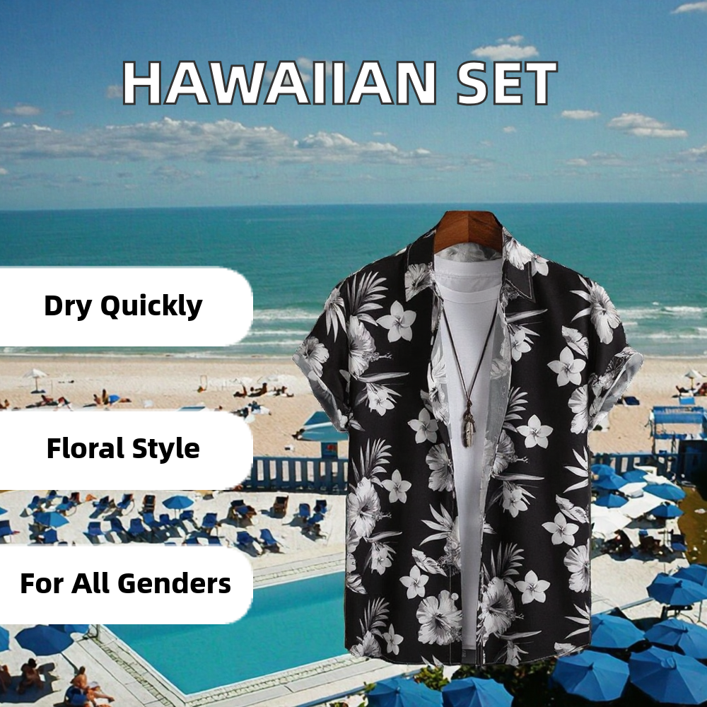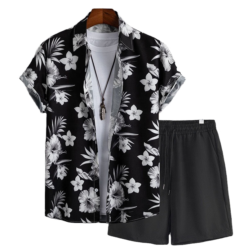 طقم ملابس رجالي صيفي كاجوال بطبعة زهور، مكون من قطعتين (قميص بأكمام قصيرة وشورت)، مصنوع من نسيج سريع الجفاف، متوفر بأحجام كبيرة، مع إمكانية إضافة شعار مخصص.