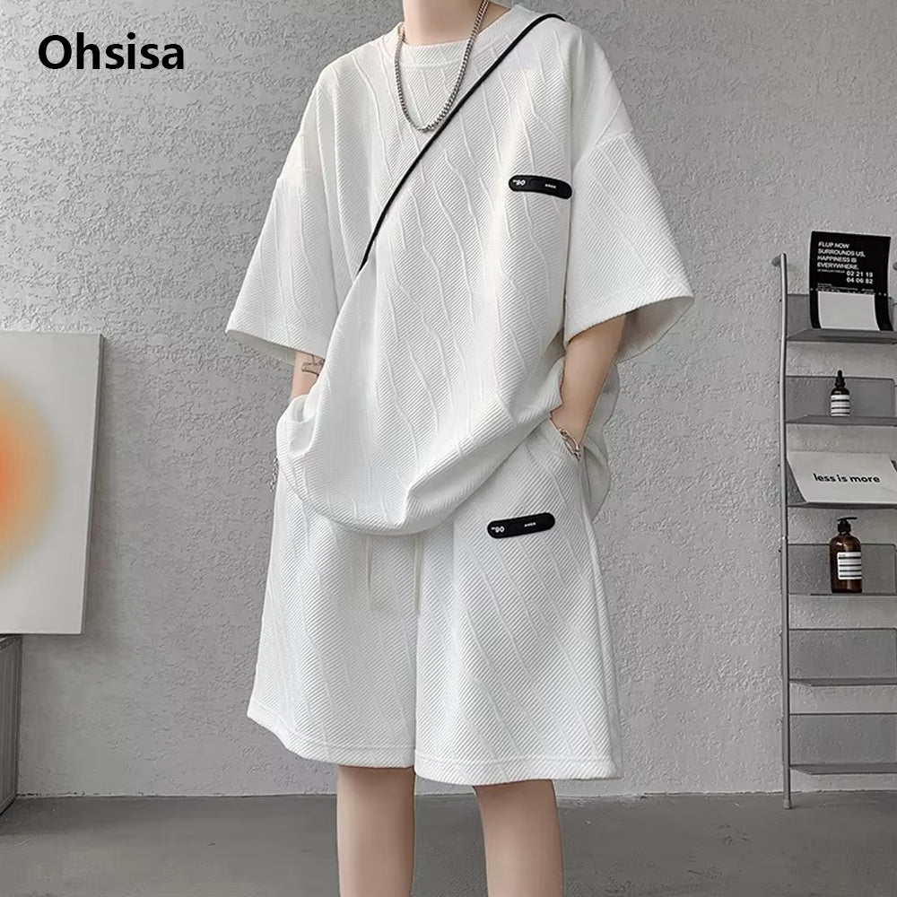 أزياء صيفية رجالية على الطراز الكوري، طقم مكون من قميص علوي + شورت فضفاض، قطعتين، بدلات رجالية غير رسمية