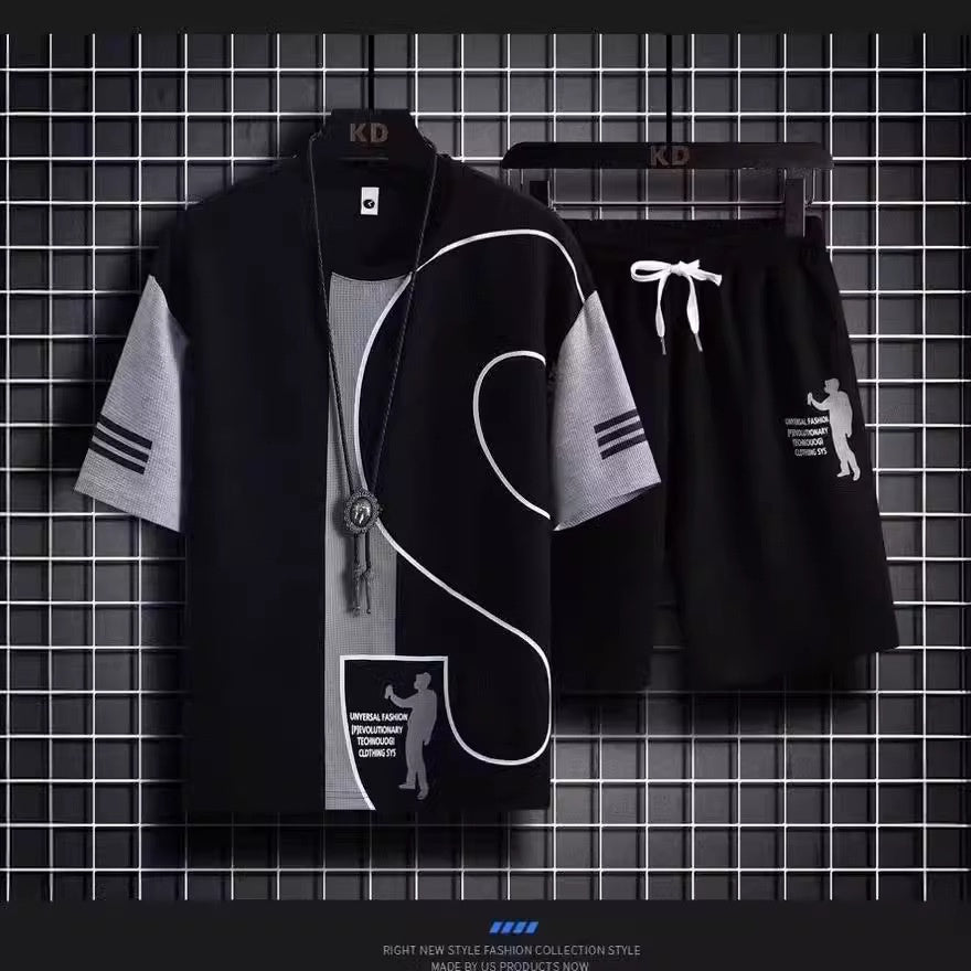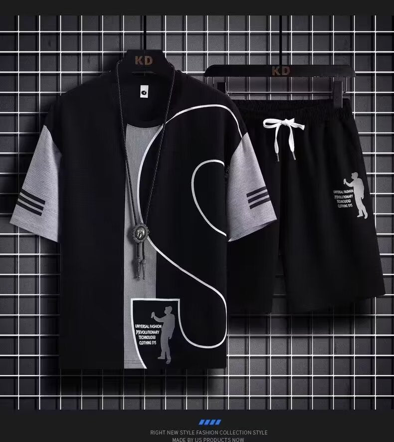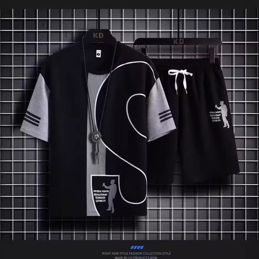 طقم رجالي مكون من قطعتين، طقم رياضي صيفي كاجوال على الطراز الكوري للأولاد، تي شيرت فضفاض بأكمام قصيرة وبنطلون بسيط بطول خمسة أطوال