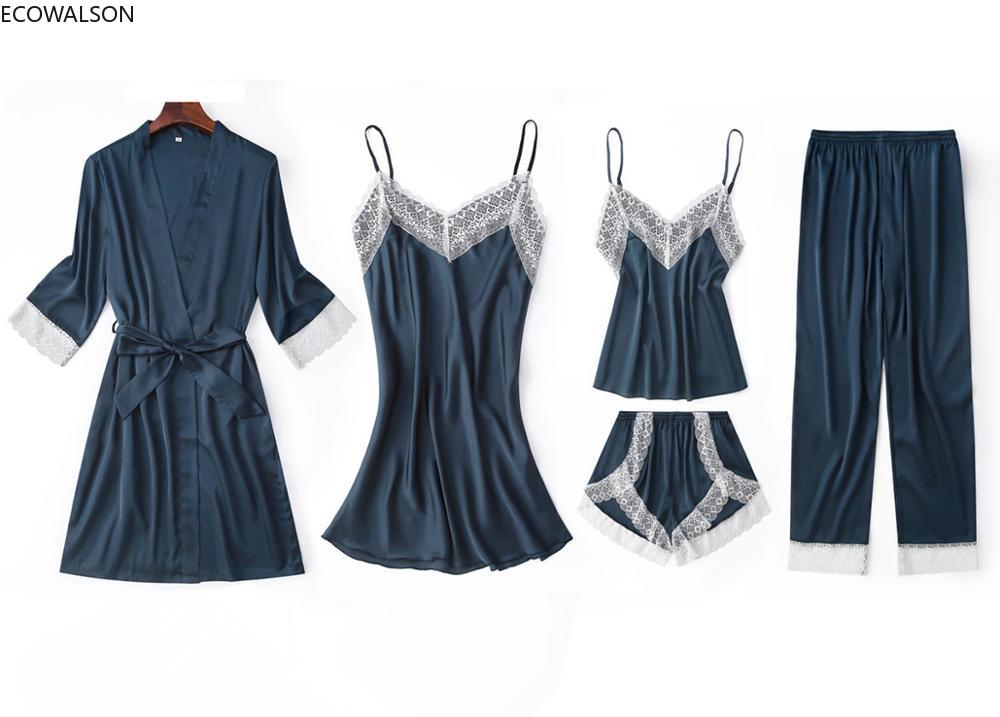 طقم بيجامة من الحرير الساتان المثير للسيدات 5-طقم بيجامة من الدانتيل للنساء ملابس نوم للخريف والشتاء ملابس نوم منزلية للنساء