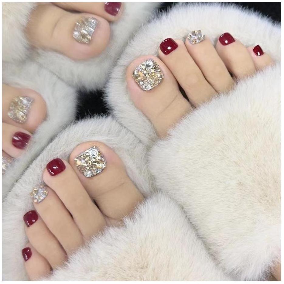 حزم سوداء سوداء شفافة من الأكريليك باللون الأحمر والوردي مصنوعة يدويًا مجموعة أظافر اصطناعية بلينغ للقدم الطبيعي
