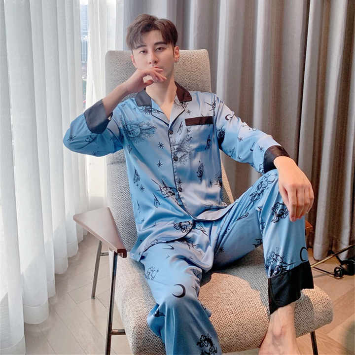 Autumn Men's Ice Silk Luxury Long Sleeve Sleepwear Boy Lapel Loose Fashion Print Two-piece Nightgown