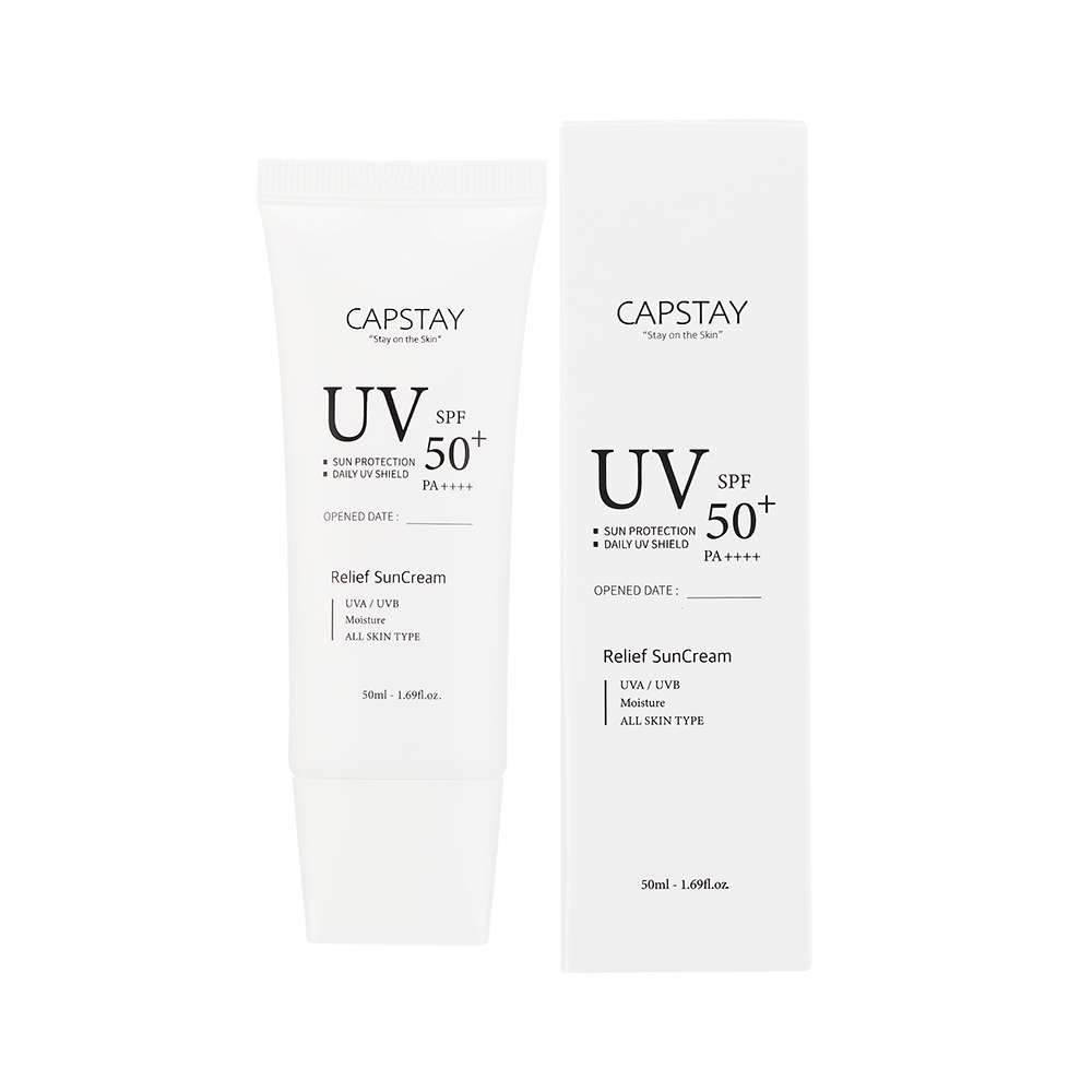 كريم شمس ثلاثي الوظائف RELIEF بعامل حماية SPF 50+ PA++++ للبشرة الحساسة، يفتح البشرة ويحسن التجاعيد، بدون آثار بيضاء، خفيف الوزن