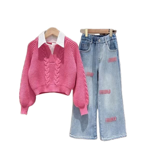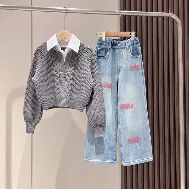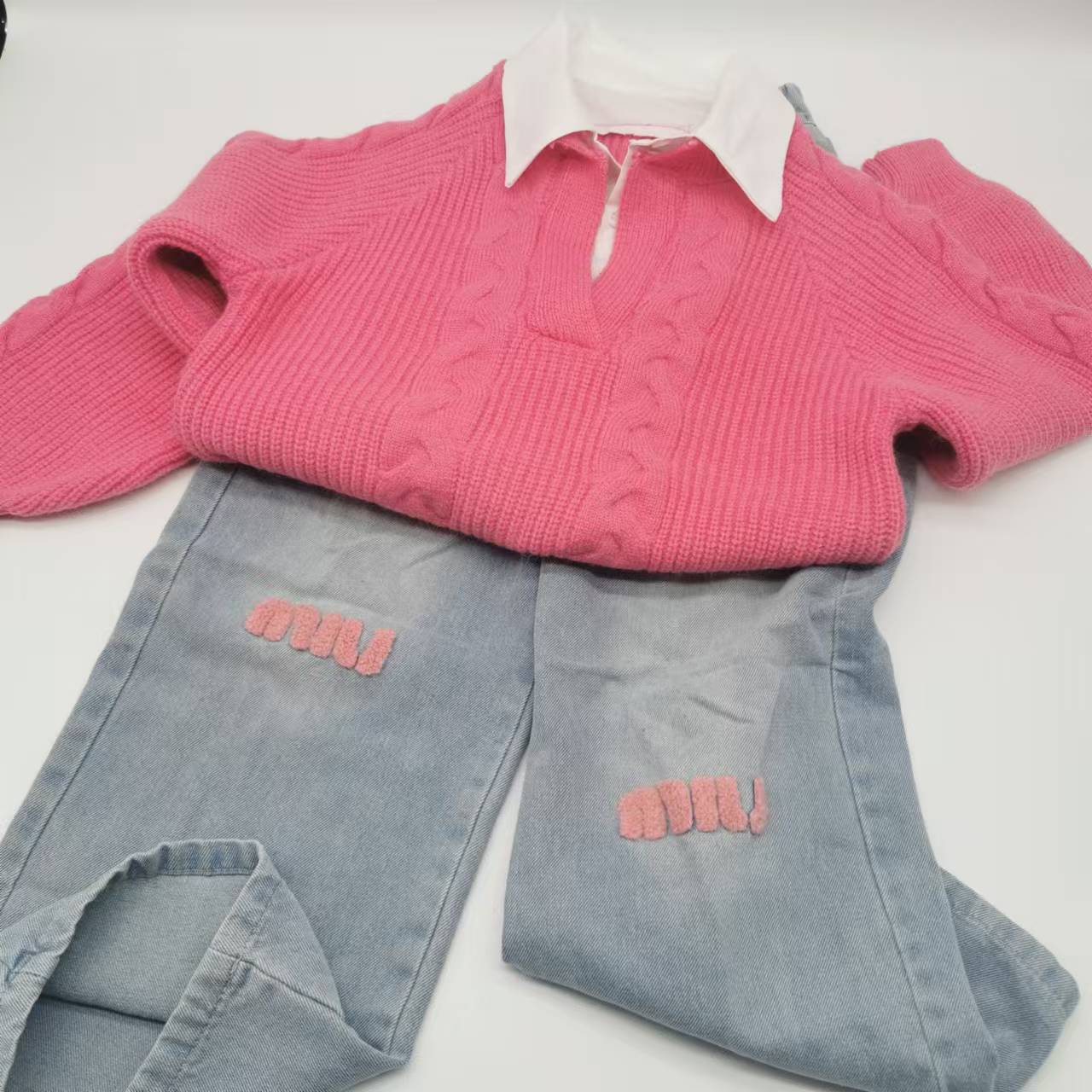 موضة جديدة 2-4-14 سنة مجموعات ملابس الفتيات سترة علوي وسراويل جينز ملابس أطفال ملابس فتيات