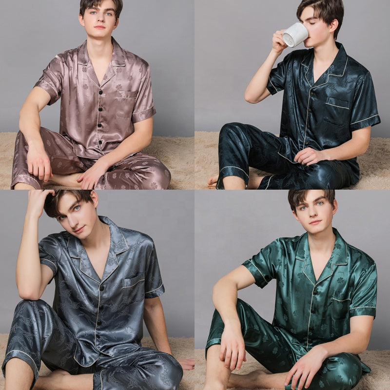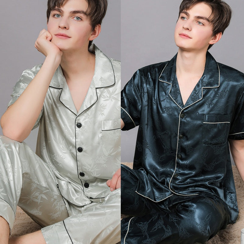 بيجامات جديدة مخصصة بأزرار للأسفل ملابس منزلية 2 بيجامات رجالية من الحرير والساتان ملابس استرخاء ملابس نوم رجالية