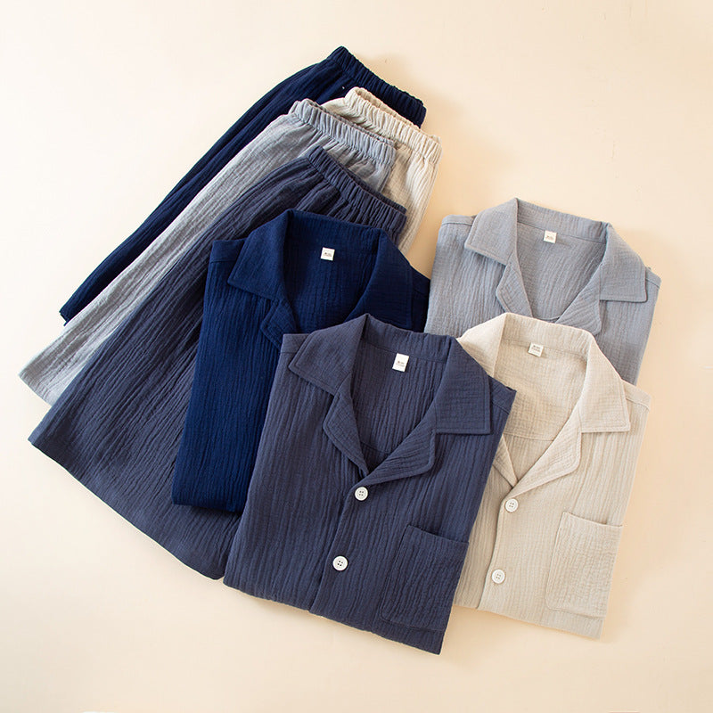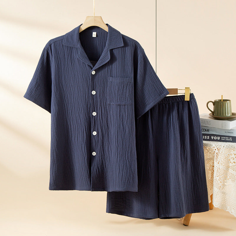 طقم بيجامات رجالي من قطعتين من القطن بلون سادة مع قميص بياقة قلابة وشورت، متوفر بمقاسات مختلفة، من مصنع ملابس النوم