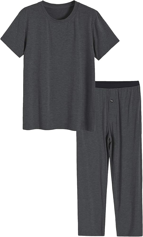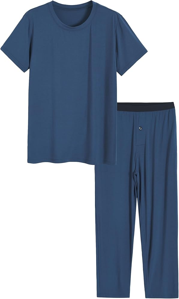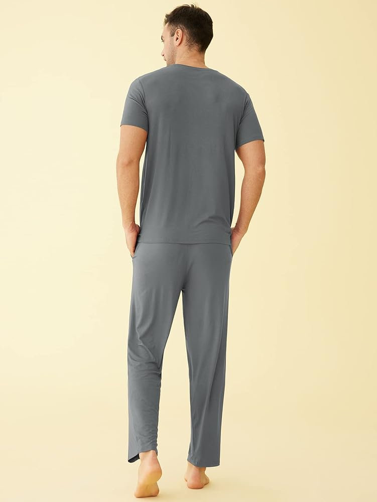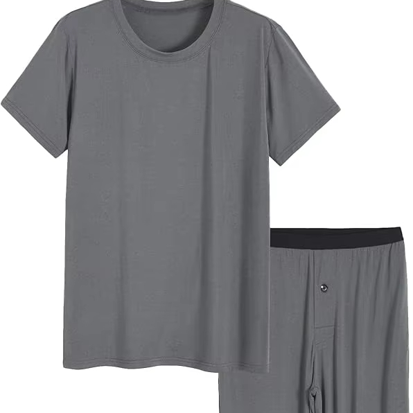 طقم بيجامة رجالي من الفيسكوز، قميص وبنطلون مع جيوب، قميص نوم، أكمام قصيرة ورقبة دائرية لأسلوب كلاسيكي، بنطلون للاسترخاء
