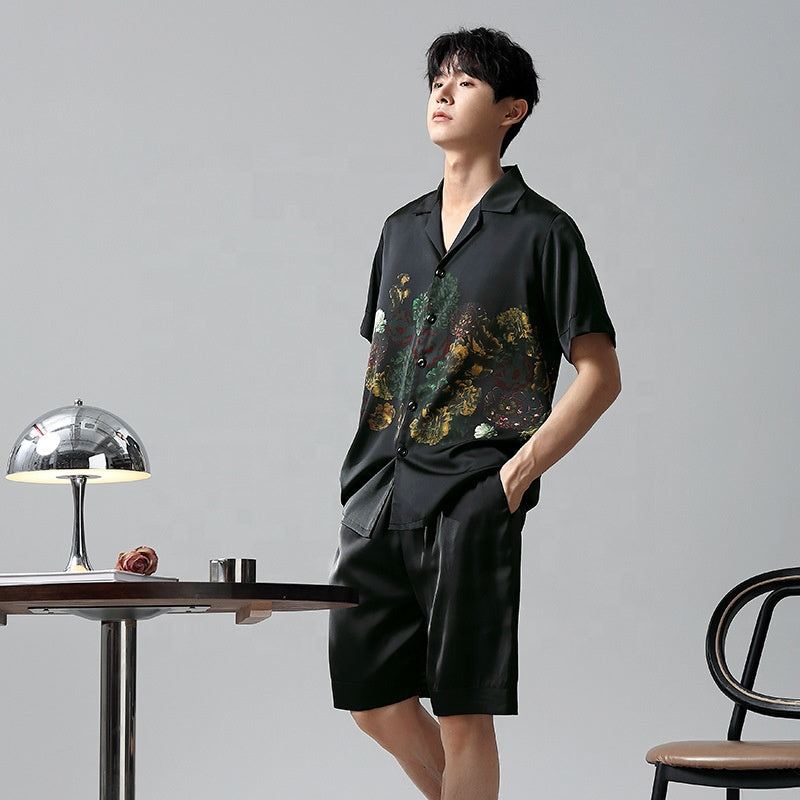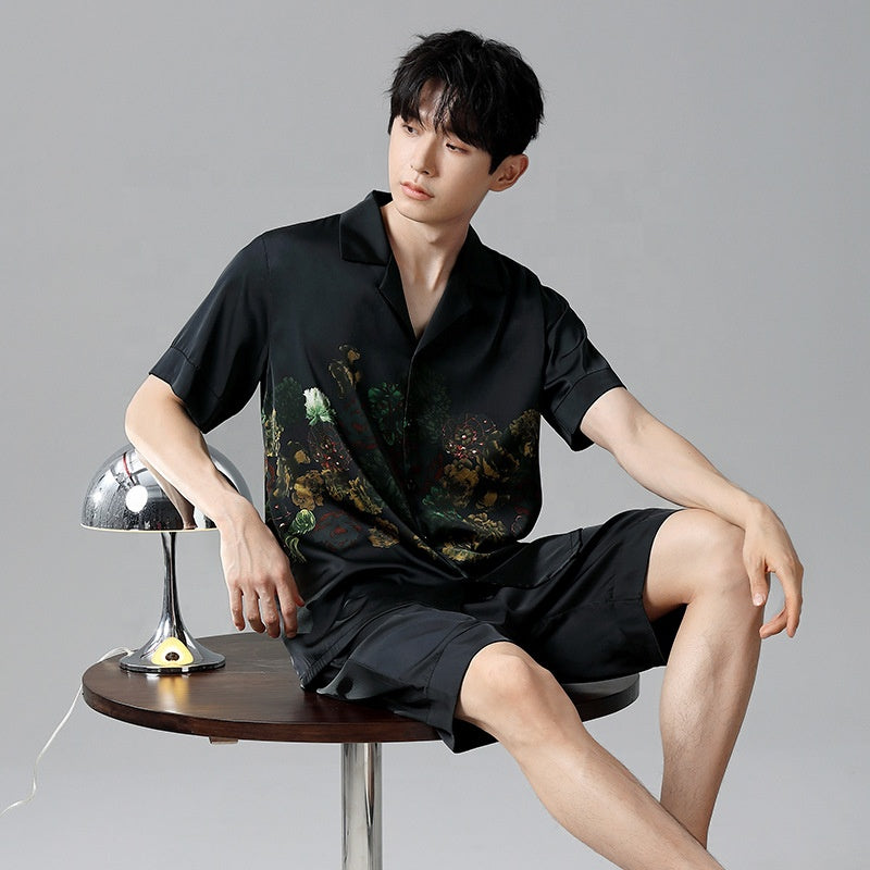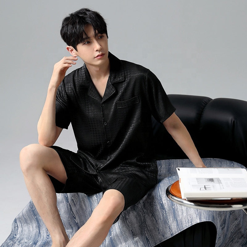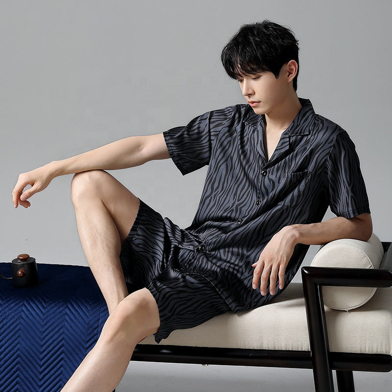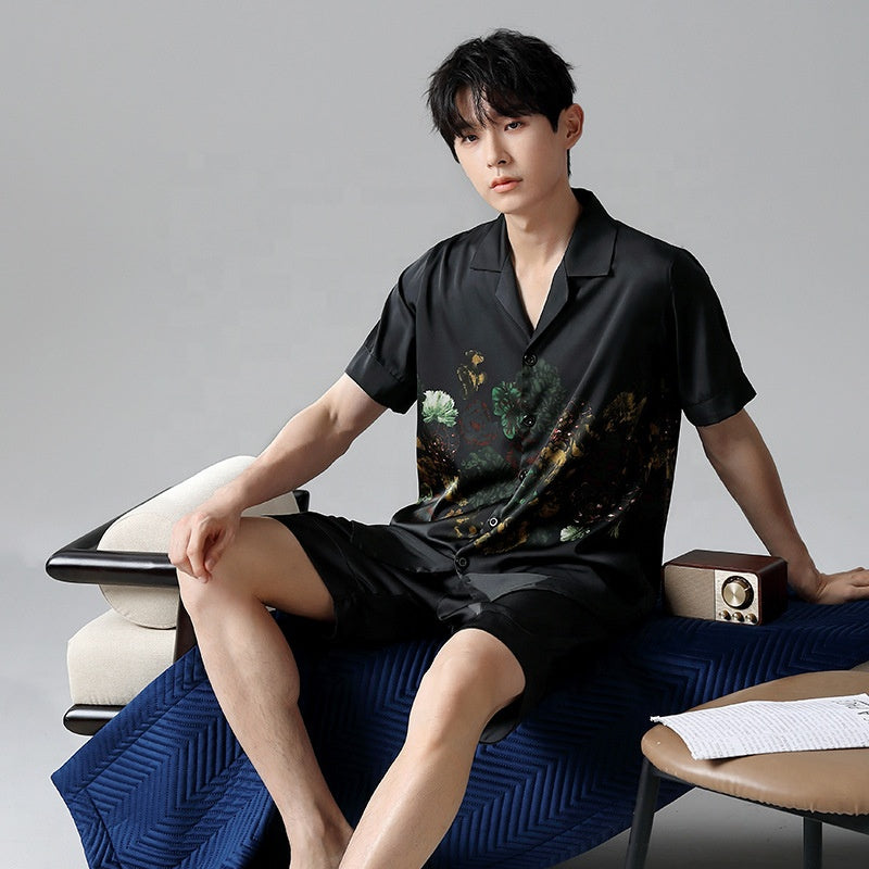 طقم بيجامة رجالي - شورت صيفي من الحرير بأكمام قصيرة للارتداء المنزلي وملابس النوم للرجال بمقاسات كبيرة
