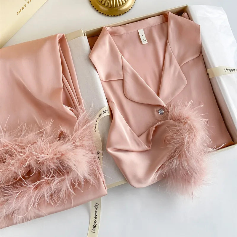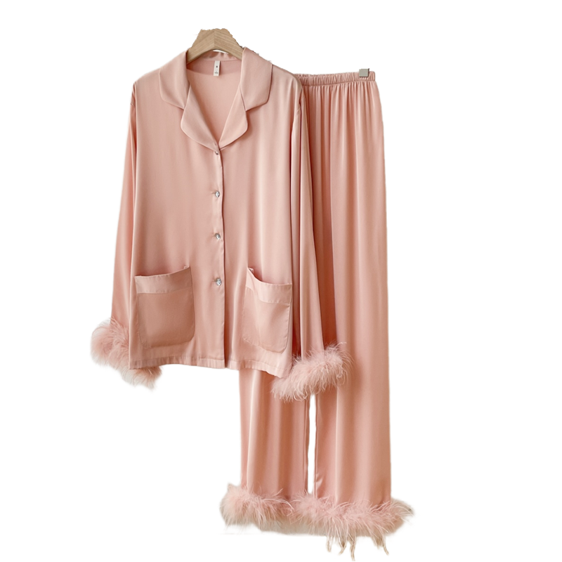 بيجامة نسائية حريرية للخريف مقاس كبير، ملابس نوم بأكمام طويلة وبنطلون، ملابس نوم حريرية مزينة بالريش، لون موحد بياقة، ملابس منزلية