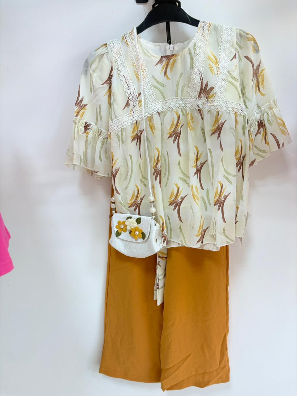 طقم قميص وبنطال واسع يجمع هذا الطقم بين الأناقة والرقة في إطلالة صيفية أو ربيعية بوهيمية الطابع طبعة مجردة بألوان ترابية وخريفية