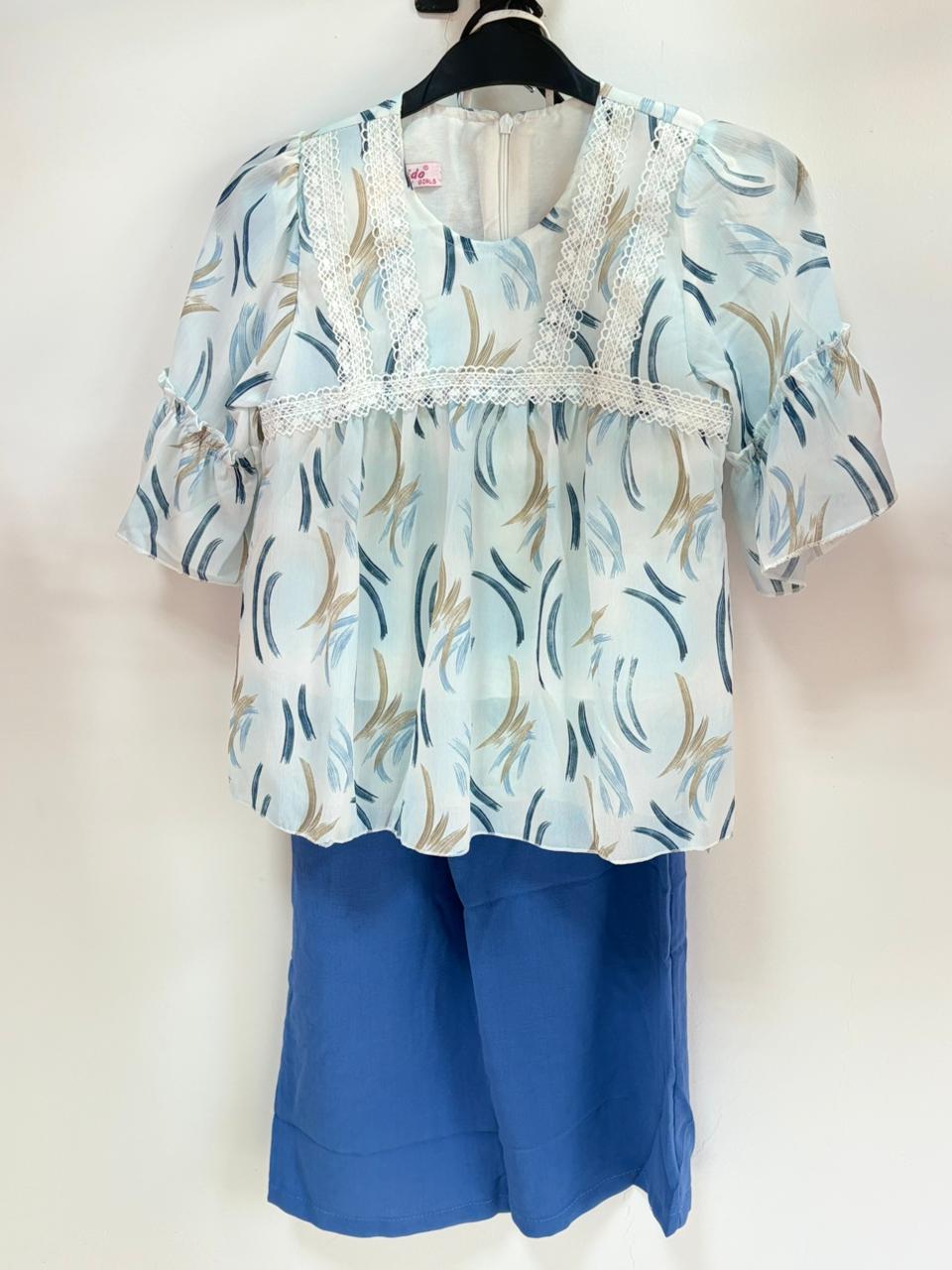 طقم صيفي ببلوزة شفافة مطبوعة وبنطال كحلي يتميز هذا الطقم بتنسيق ألوان مستوحى من الأجواء البحرية والزرقاء، وهو مثالي لإطلالة ربيعية أو صيفية مريحة