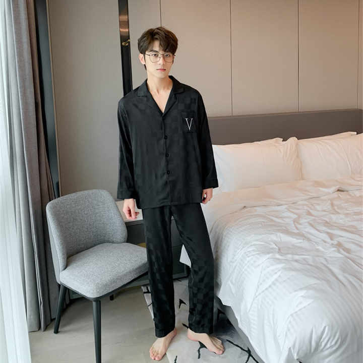 New Spring and Autumn Pajamas Ice Silk Long Sleeve Homewear Jacquard Pajamas Men's Large Size Casual Thin Night Suit Boys