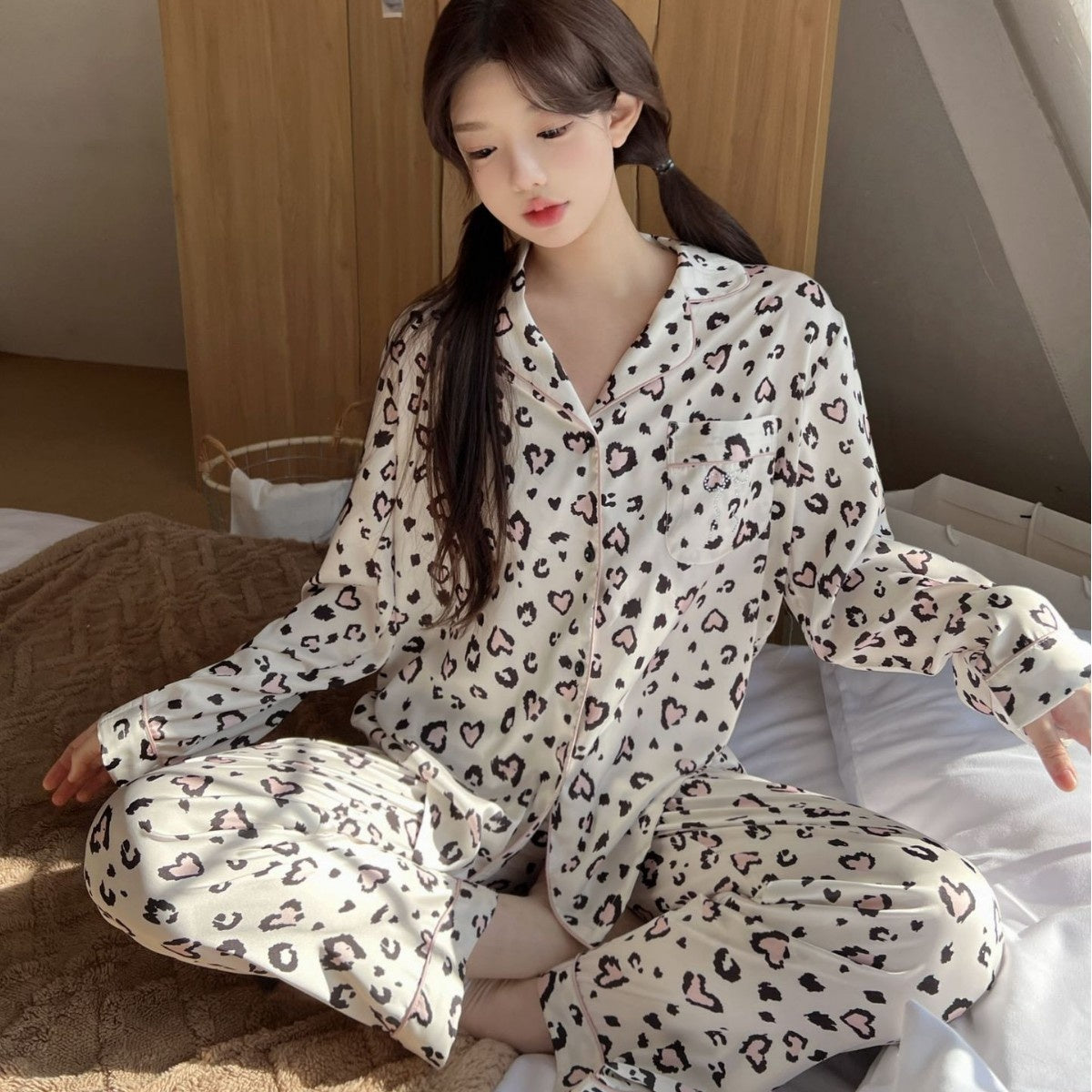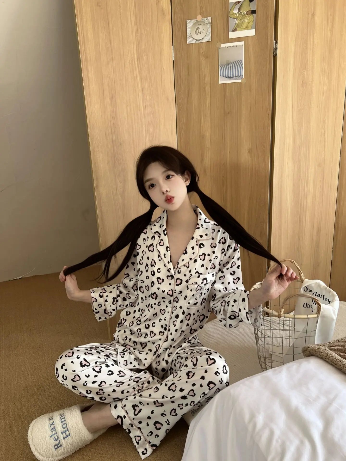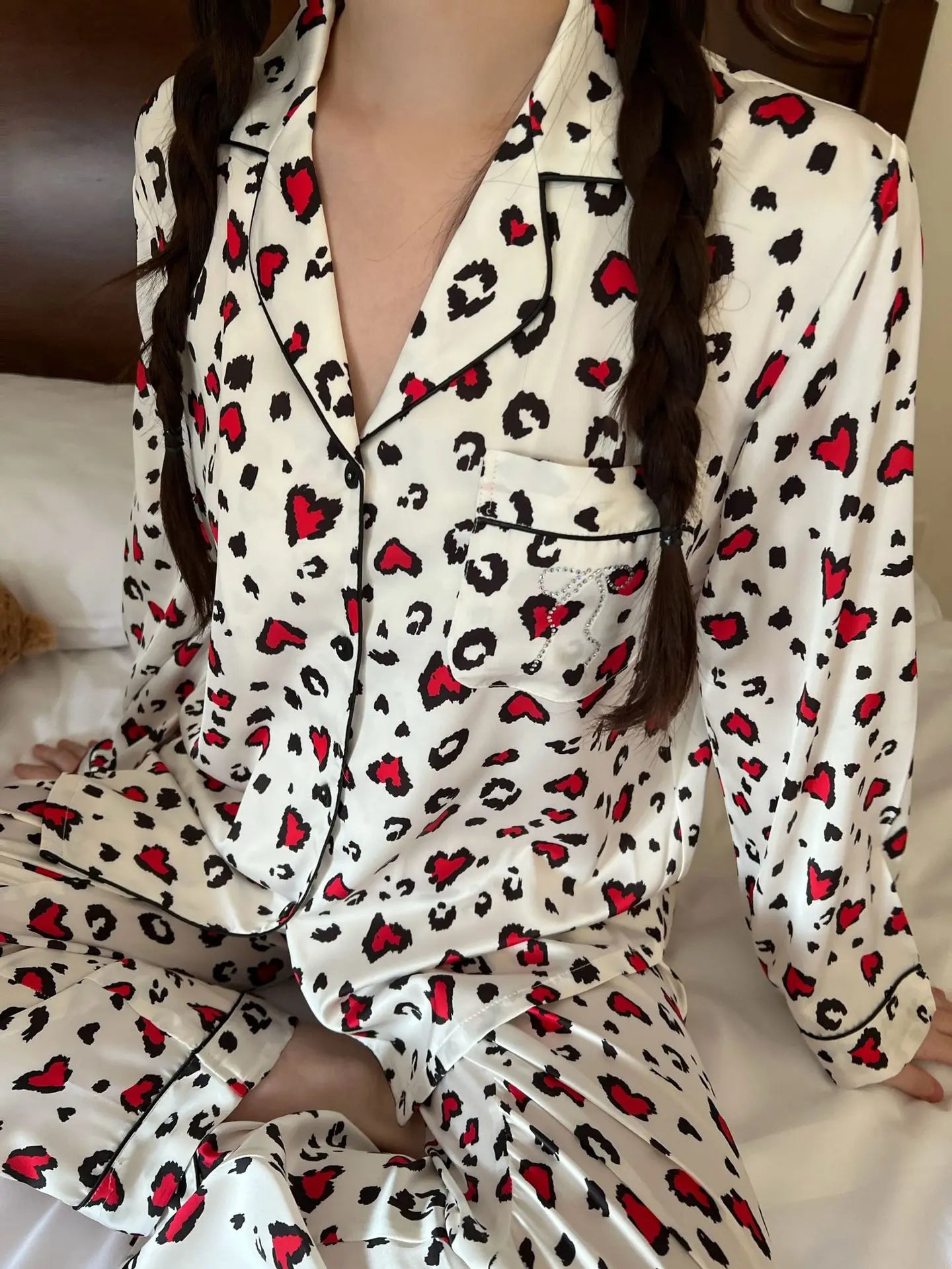 بيجامة نسائية بنمط ماسي مطرز على شكل قلب، ملابس نوم ربيعية من الحرير الصناعي بأكمام طويلة، طقم ملابس منزلية غير رسمية
