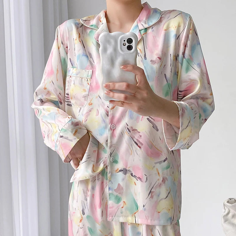 بيجامة نسائية جديدة لربيع 2024 من الساتان، طقم أنيق من قطعتين بأكمام طويلة وبنطلون مطبوع من الحرير، ملابس نوم كاجوال بياقة ومقاسات كبيرة