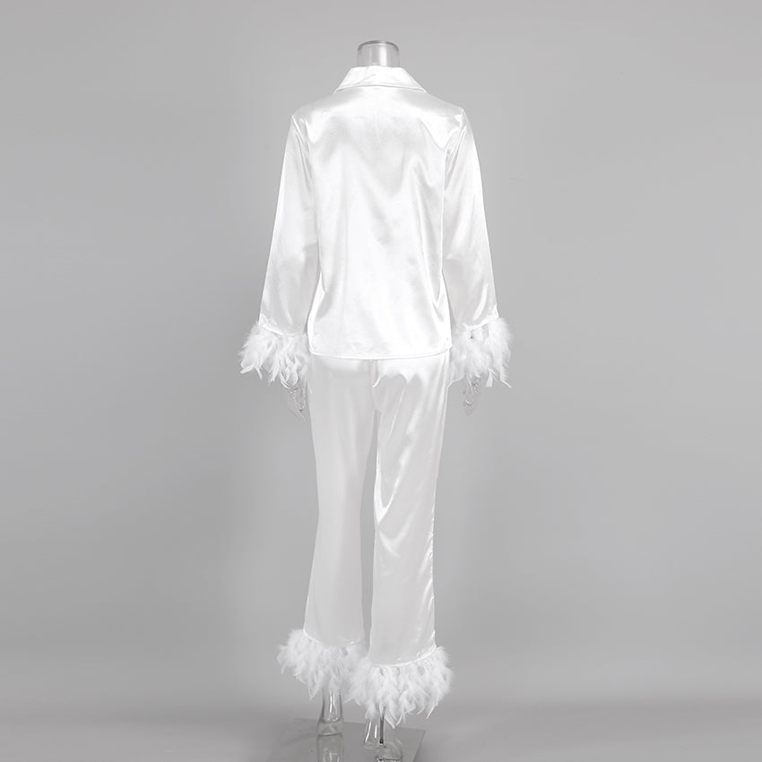 طقم بيجامة نسائي أنيق من الساتان من QINSI لعام 2025 مع ريش، تصميم عصري غير رسمي بنمط صلب، ملابس منزلية من قطعتين لفصل الربيع