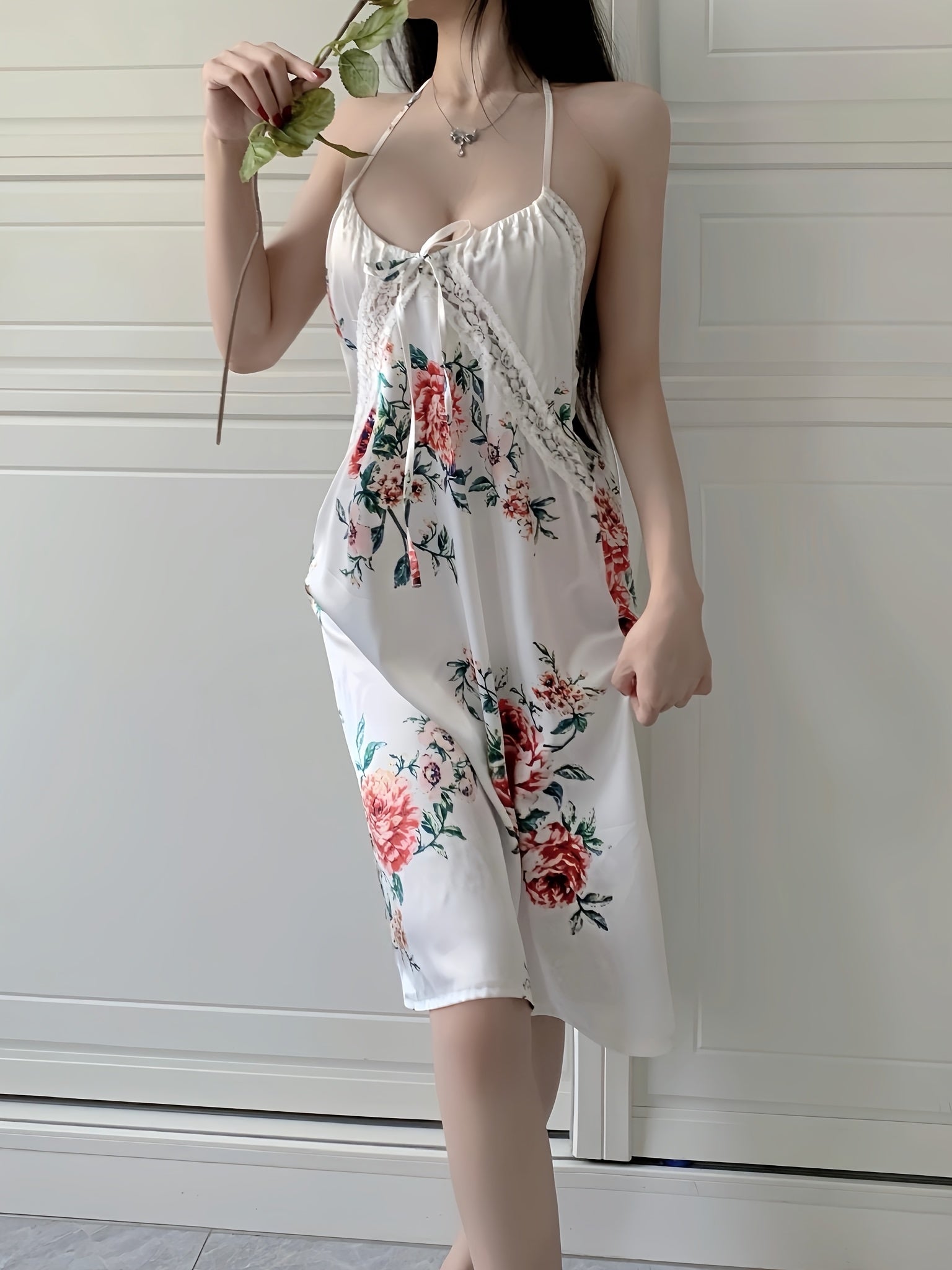 قميص نوم ساتان رومانسي جذاب مقاس XL، مطبوع بتصميم حلو مع دانتيل، فتحة صدر عميقة على شكل V، حمالات رفيعة، رقبة هالتر، مريح وقابل للتنفس، مناسب للصيف والربيع