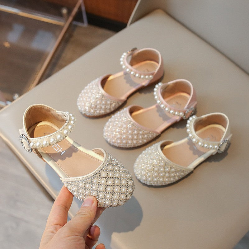 أحذية أنيقة للأطفال على شكل أحذية الأميرة، مثالية للحفلات والرقص، أحذية مسطحة مزينة باللؤلؤ، مناسبة للأداء على المسرح.