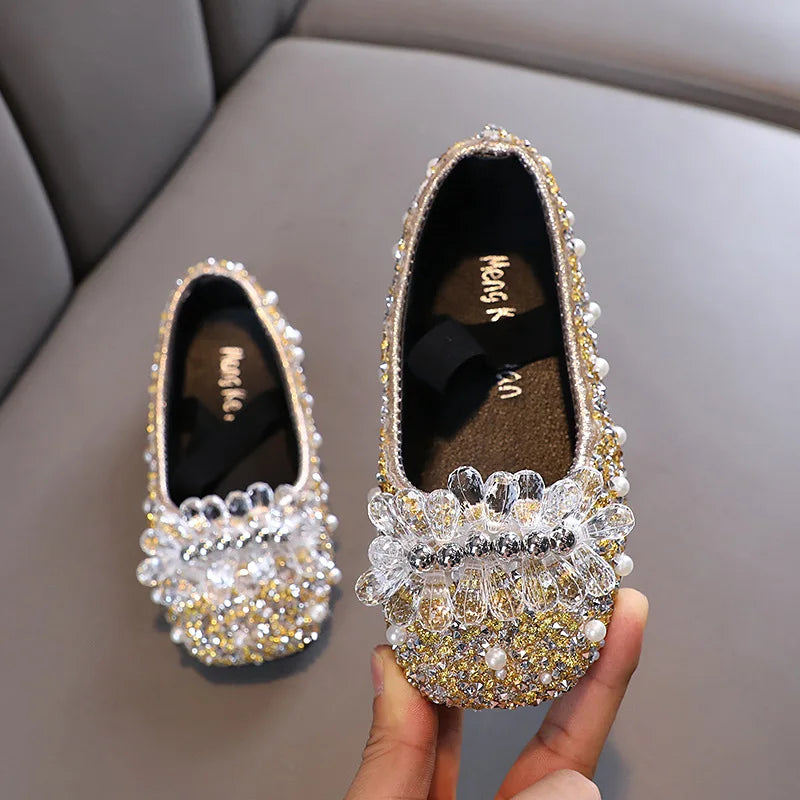 أحذية باليه صيفية جيدة التهوية للأطفال مسطحة كريستال زهرة لؤلؤ زينة أحذية فستان براقة للبنات حفلات حفلات ربط