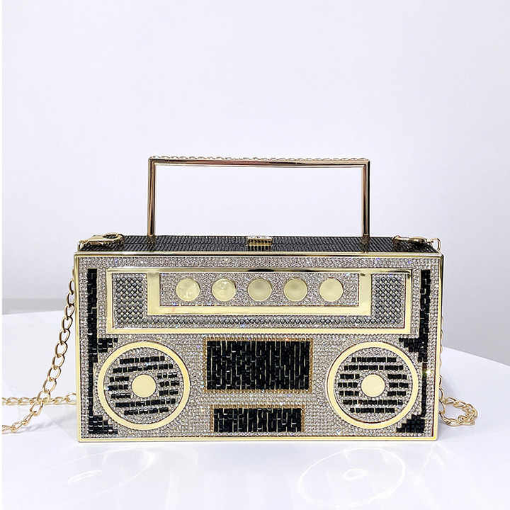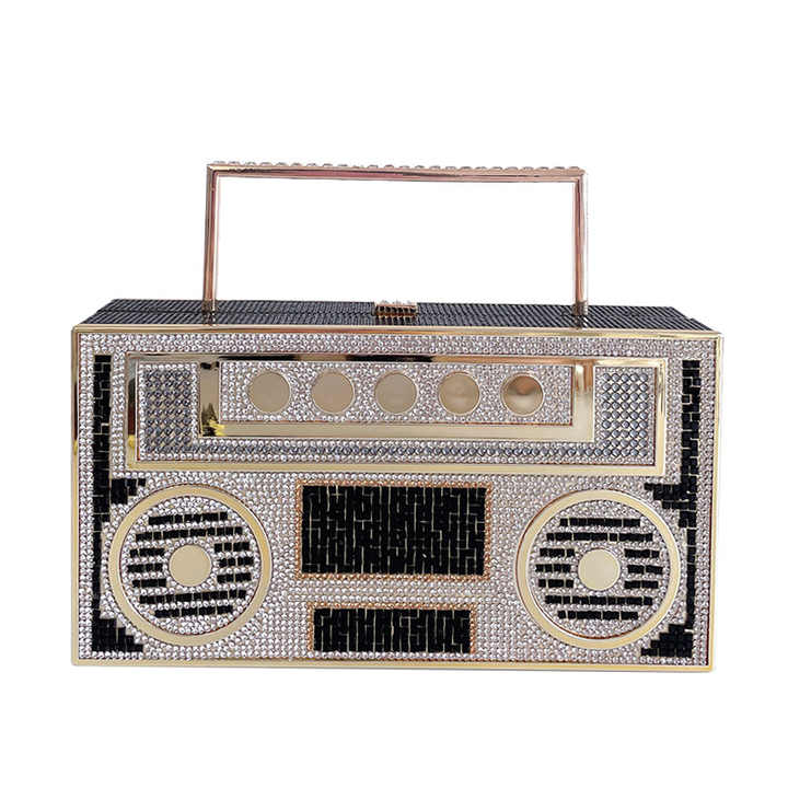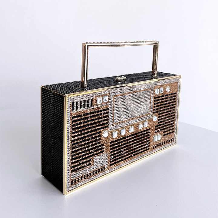 Luxury Woman's Retro Radio Crystal Evening Clutch Bag for Wedding Party Bridal Ladies Metal Handle Rhinestone Handbag and Purse
