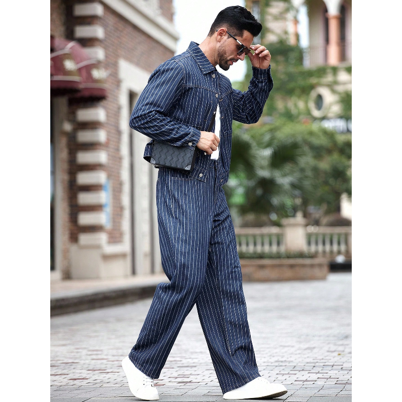 سترة جينز مخططة عصرية للرجال ومجموعة سراويل واسعة الساق