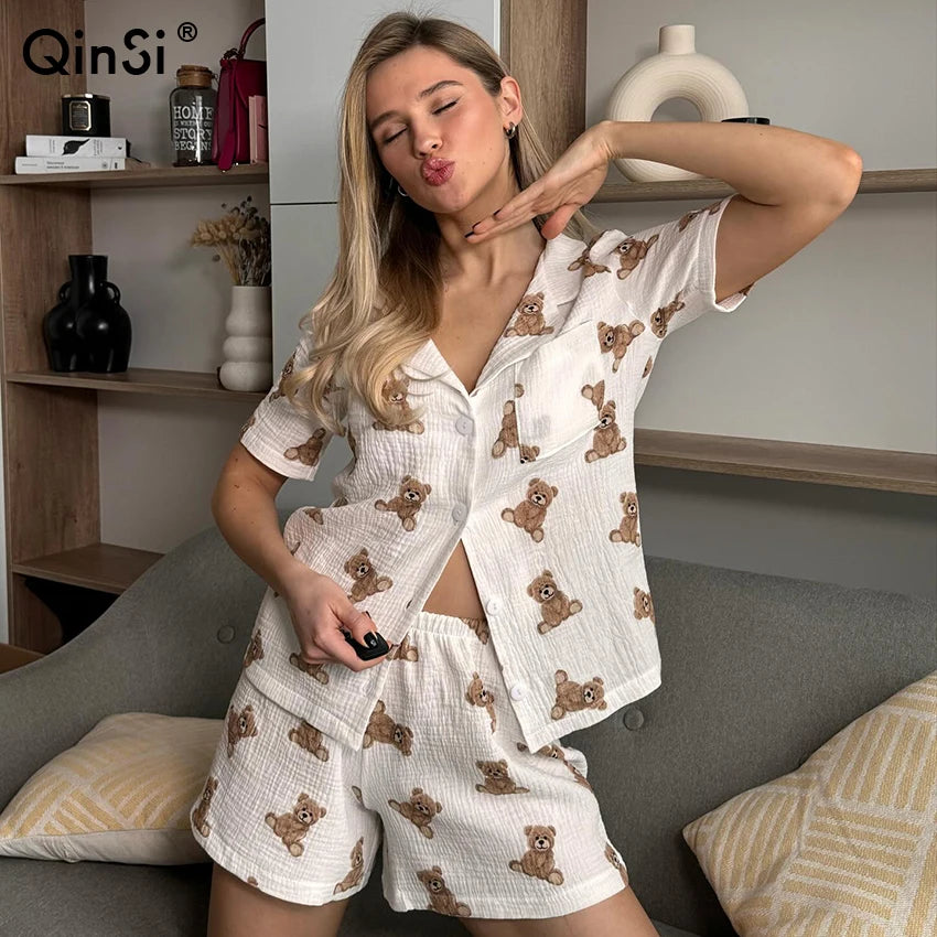 شورت نوم نسائي كاجوال من QINSI بأكمام قصيرة من القطن والكتان بياقة على شكل V وأزرار أمامية مع طباعة