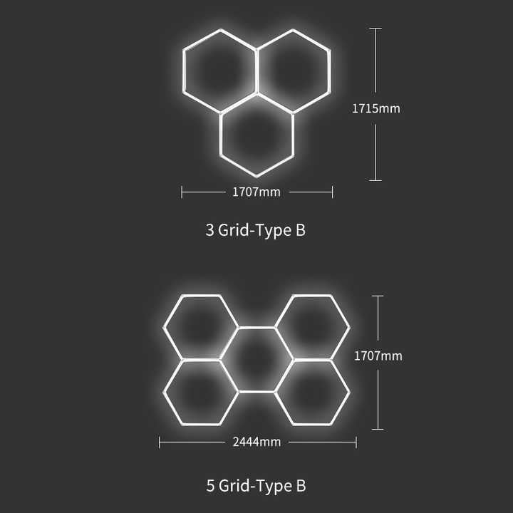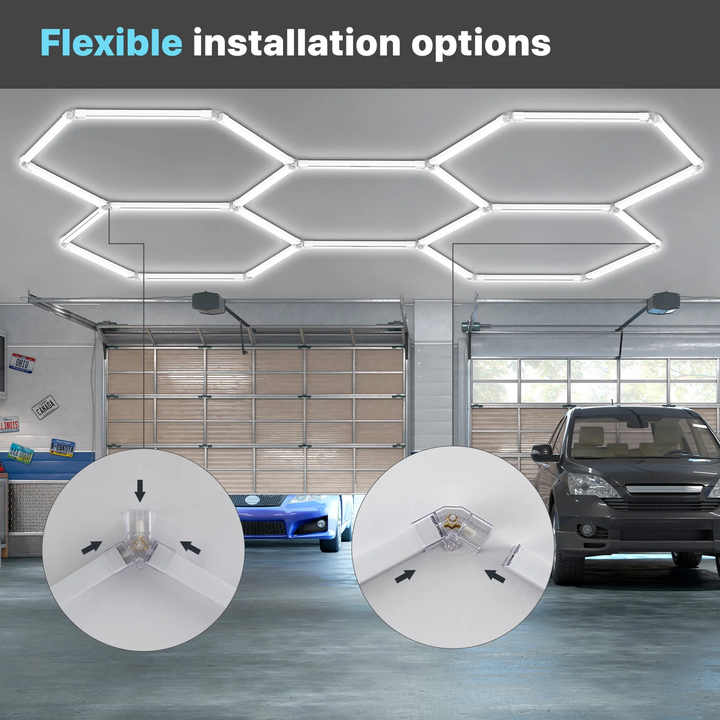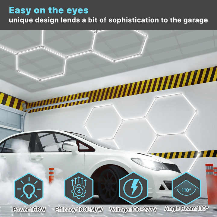 Hair salon, barber shop, car wash, studio, business, hexagon, honeycomb, hexagon, detail, led lights, hexagon, garage ceiling light
