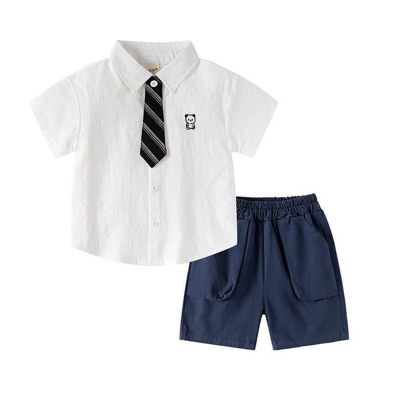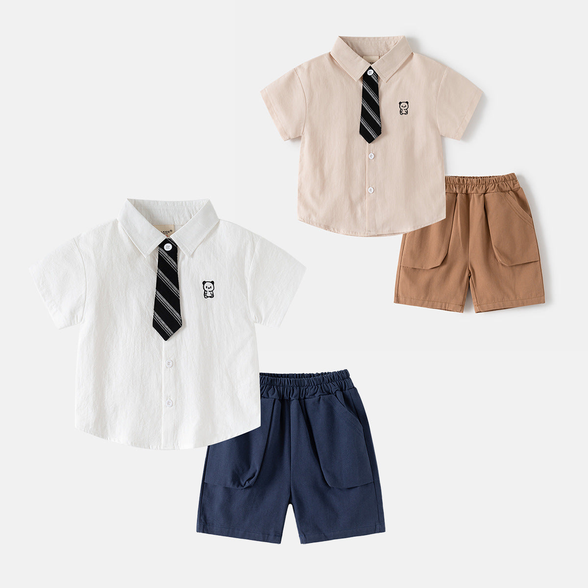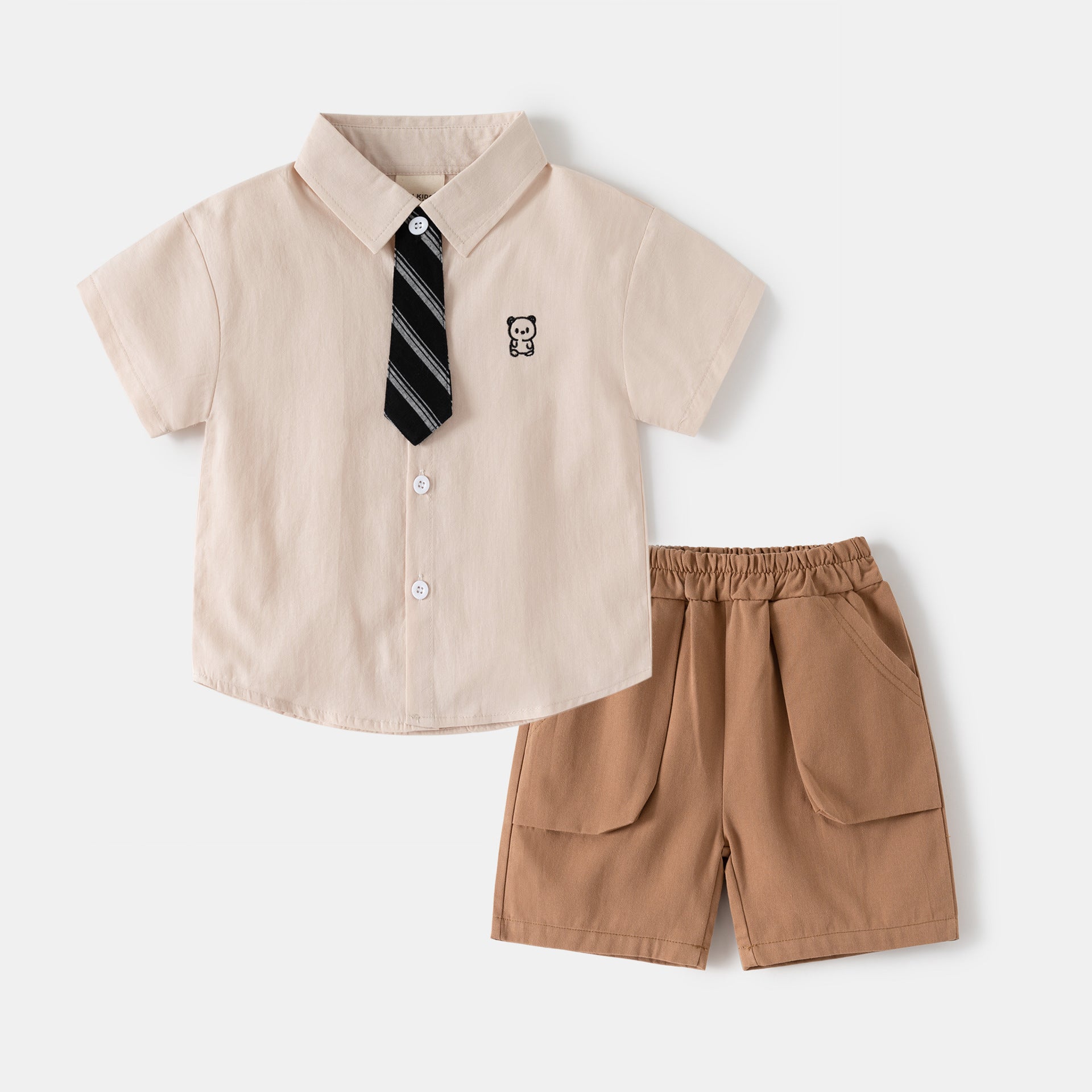 طقم كاجوال للأطفال من قطعتين بلوزة فضفاضة بأكمام قصيرة مع طية صدر رفيعة بدلة بنطلون قطني للأولاد