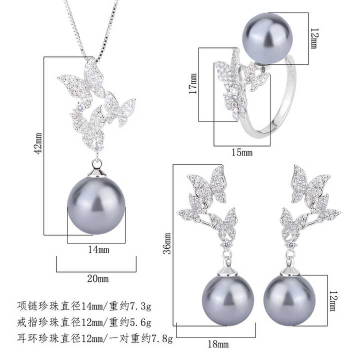 Butterfly Pearl Jewelry Set for Women, Grey Pearl Stone Cubic Zirconia, Flower Jewelry Set for Women, Fashion