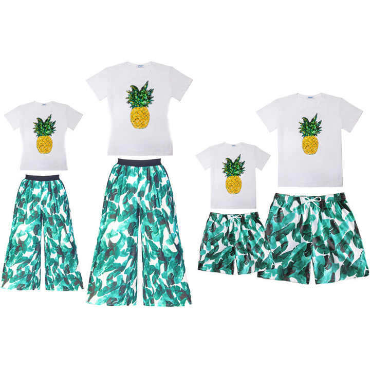 New Mother and Daughter Wide Leg Pineapple Short Sleeve Rompers Pants Outfits Beach Holiday Clothes