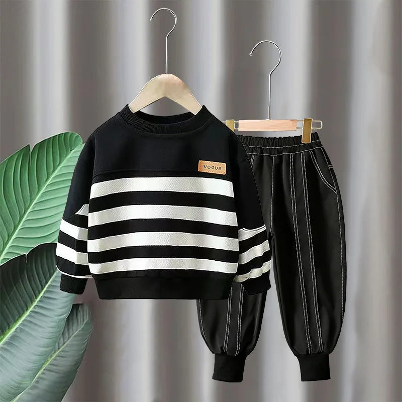 ملابس أطفال جديدة للربيع والخريف 2-8 سنوات ، كنزة صوفية مخططة + بنطال ، أطقم ملابس كاجوال من قطعتين للأولاد