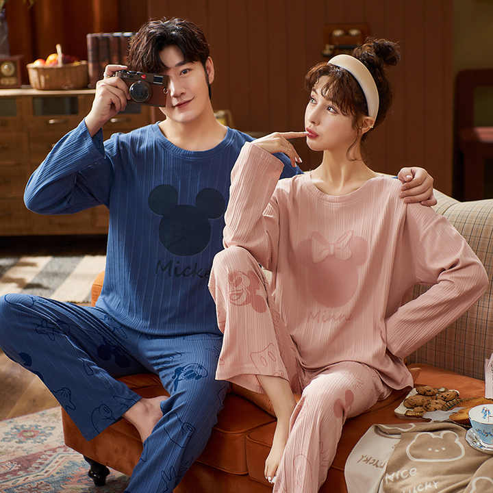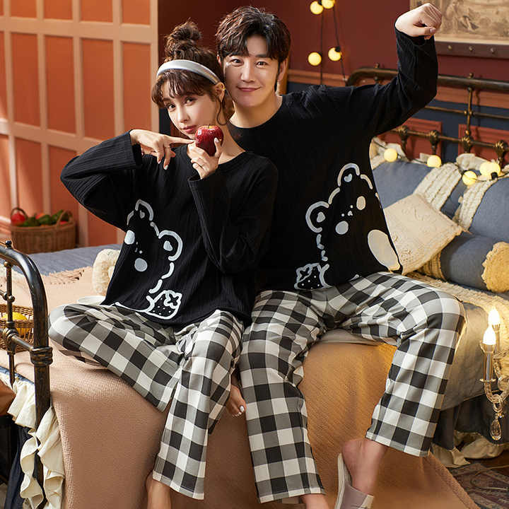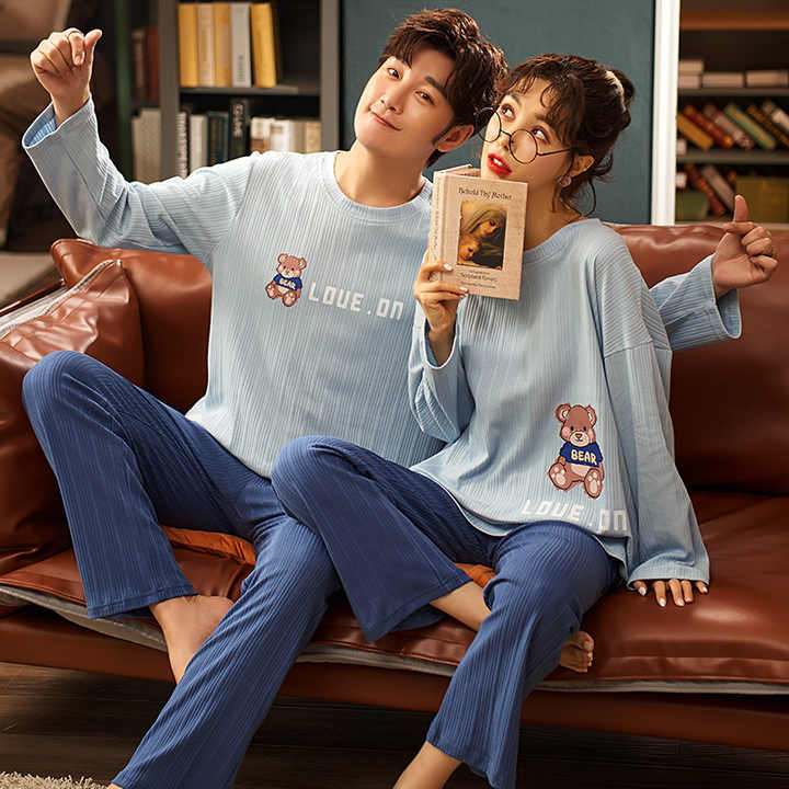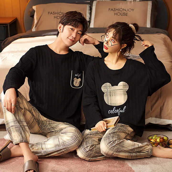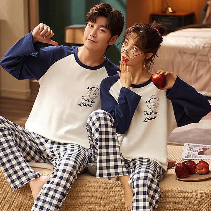 New Men's and Women's Cotton Long Sleeve Crew Neck Sleepwear Set for Spring Summer Autumn