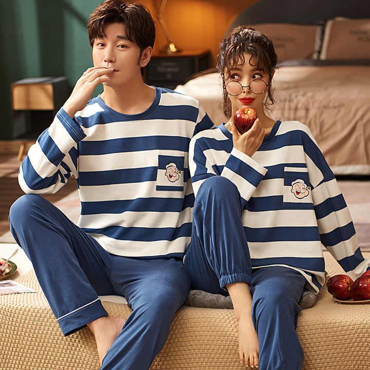 New Men's and Women's Cotton Long Sleeve Crew Neck Sleepwear Set Suitable for Spring, Summer and Autumn