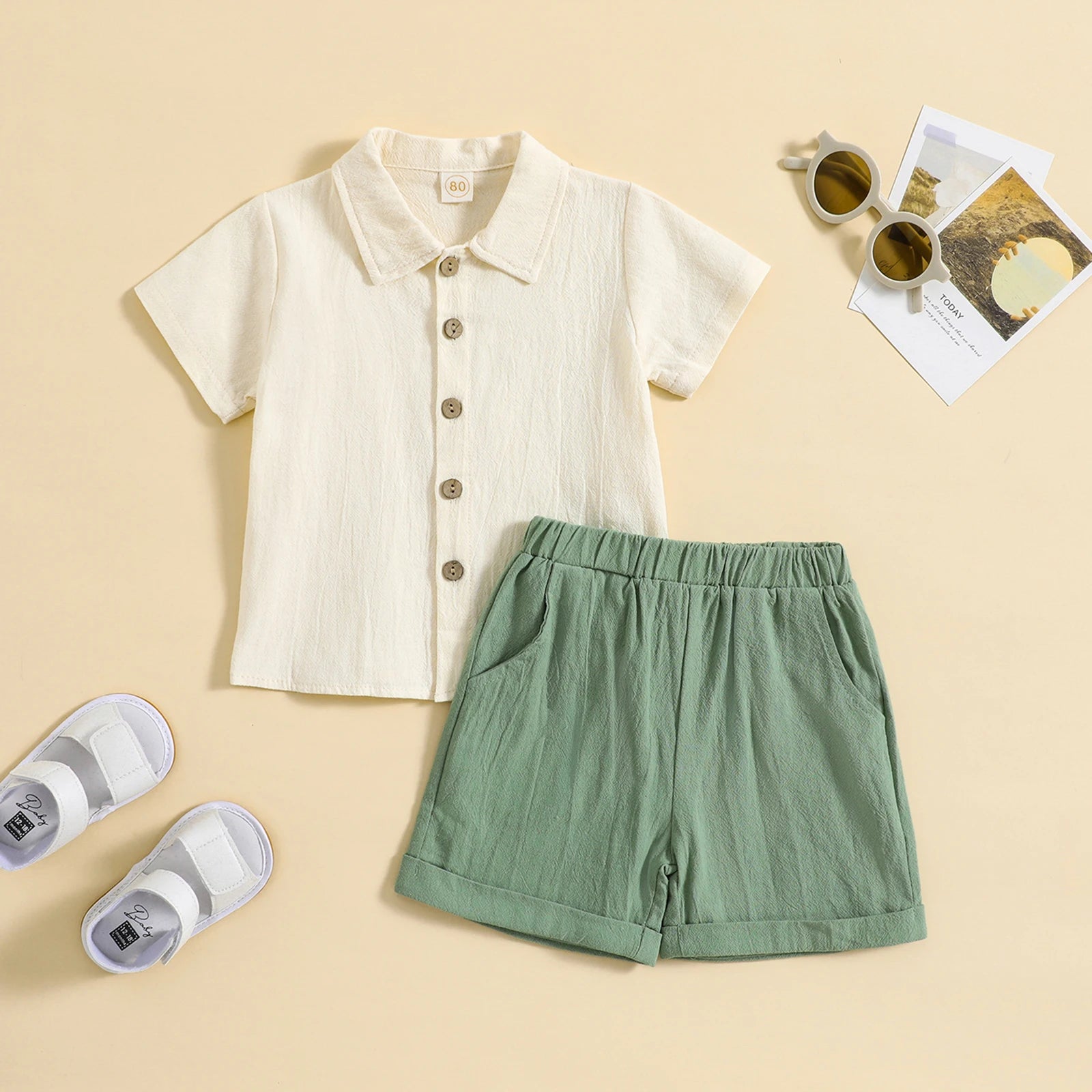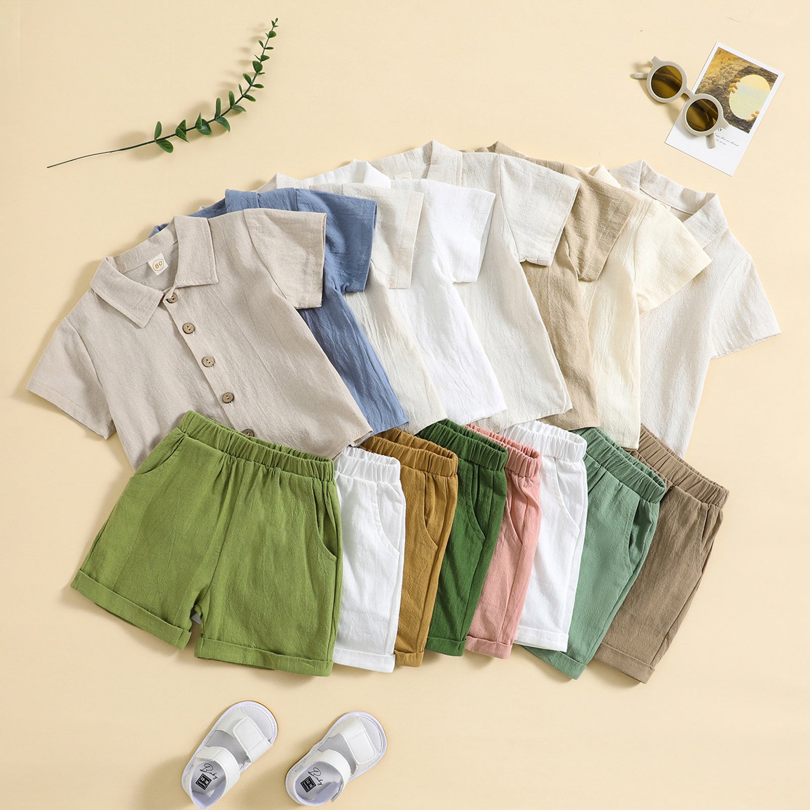 ملابس الصيف الصلبة من القطن والكتان ذات الياقة المنثنية الى الاسفل قمصان قصيرة الأكمام سراويل مطاطية مجموعات ملابس الاولاد 2 قطعة مجموعات ملابس الاولاد