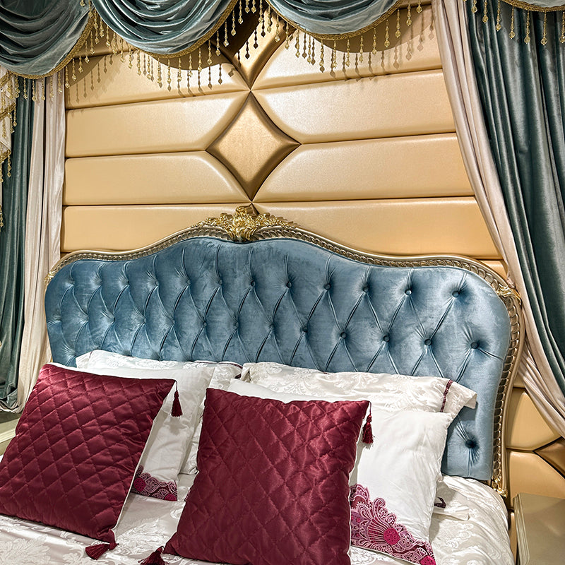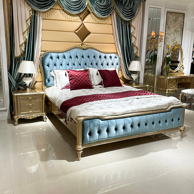 طقم سرير من القماش الفرنسي ، طقم سرير من الخشب الصلب المزدوج على الطراز الأوروبي ، سرير من القماش الأزرق ، من القماش الفرنسي