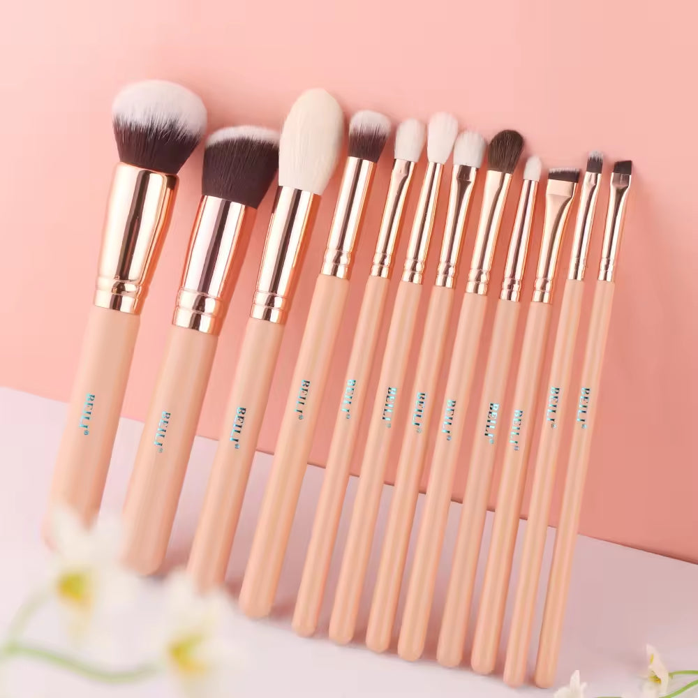 طقم فرش مكياج بمقبض خشبي وردي 12 ، شعر ماعز طبيعي كثيف وناعم مع شعار مخصص فرش مكياج احترافية