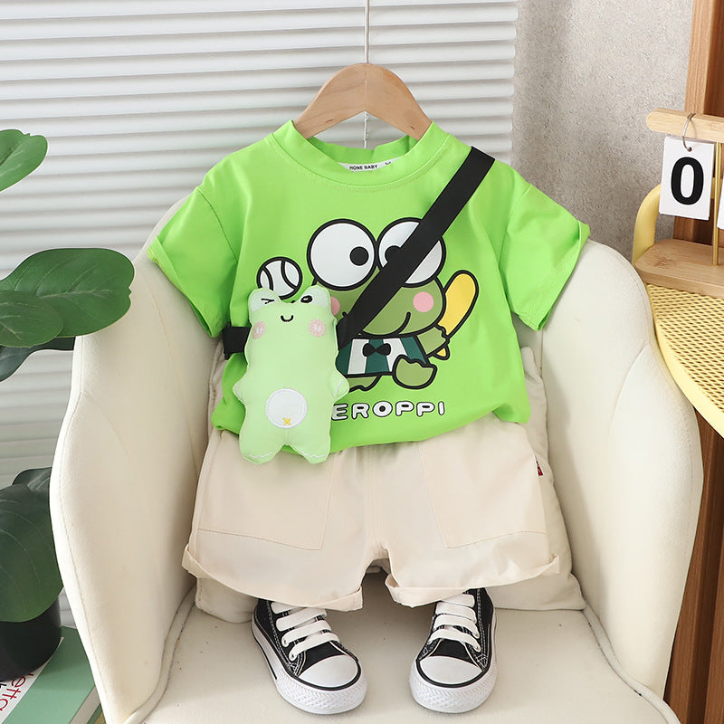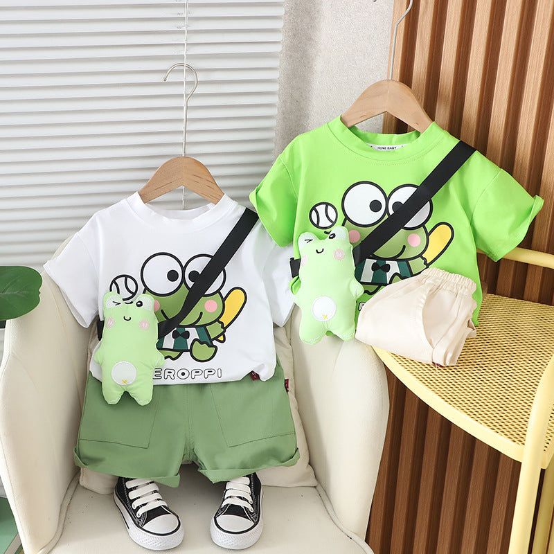 ملابس أطفال صيفية 2025، طقم قطعتين بأكمام قصيرة مع حقيبة على شكل ضفدع، ملابس لطيفة للأولاد الصغار