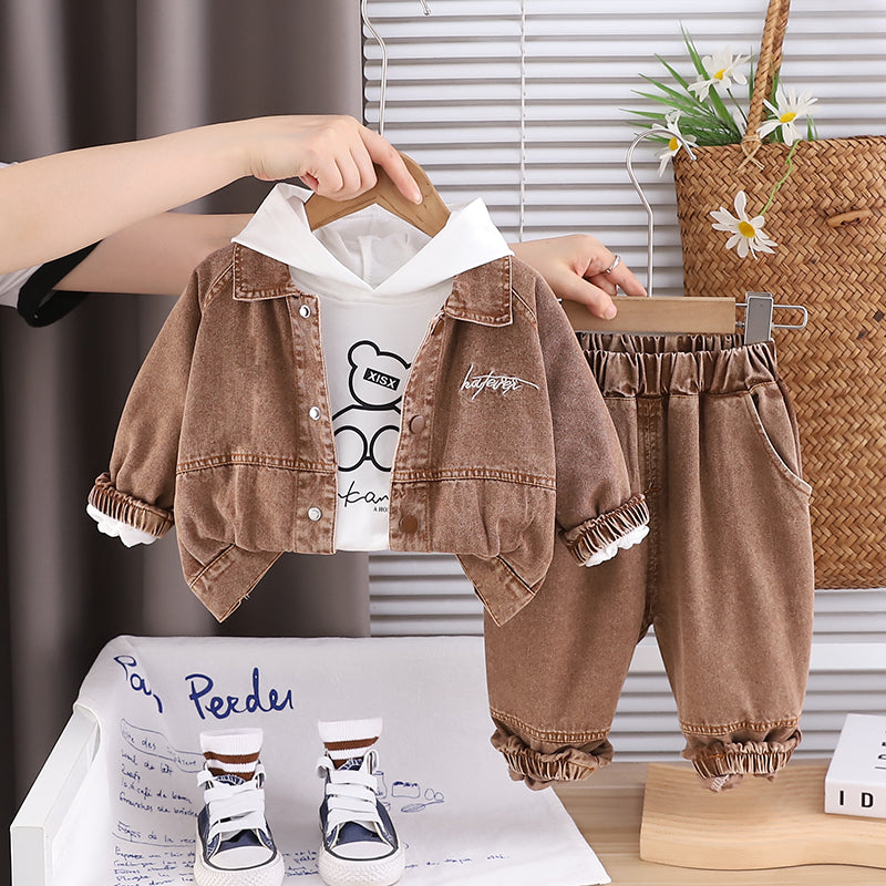 بدلة غير رسمية من ثلاث قطع للأولاد الصغار من عمر 1-5 سنوات بنمط كرتون جاكيت جينز من الدنيم ومعاطف ملابس خارجية بدلة أطفال مثالية