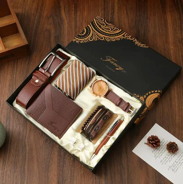 منتجات رائجة لعام 2025: مجموعة هدايا تجارية تشمل ساعة كوارتز للرجال، نظارات، قلم، سلسلة مفاتيح، حزام ومحفظة