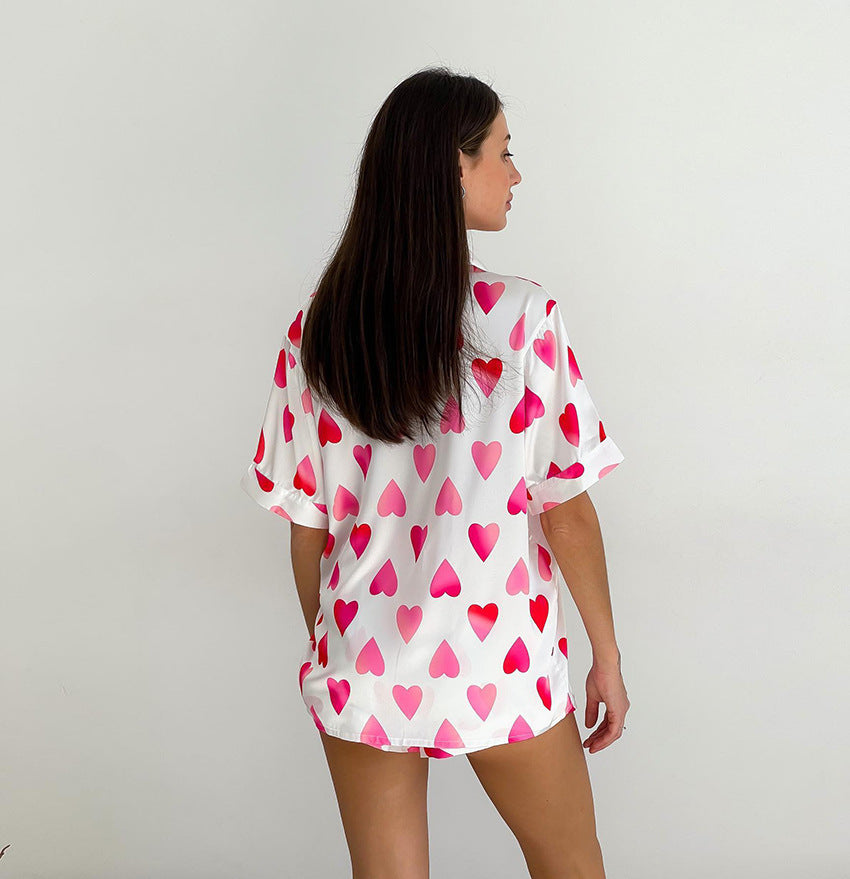 طقم بيجامات حريرية من الساتان للنساء للصيف على شكل قلب وأكمام قصيرة وأزرار طقم ملابس نوم ناعمة قابلة للتنفس