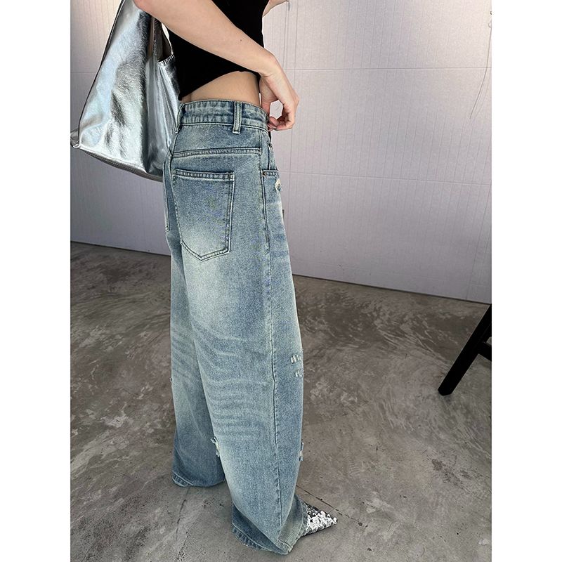 القيام الجينز القديم ممزق غسلها وارتداء النساء فضفاضة عالية مخصر التخسيس بنطلون مستقيم مسح السراويل