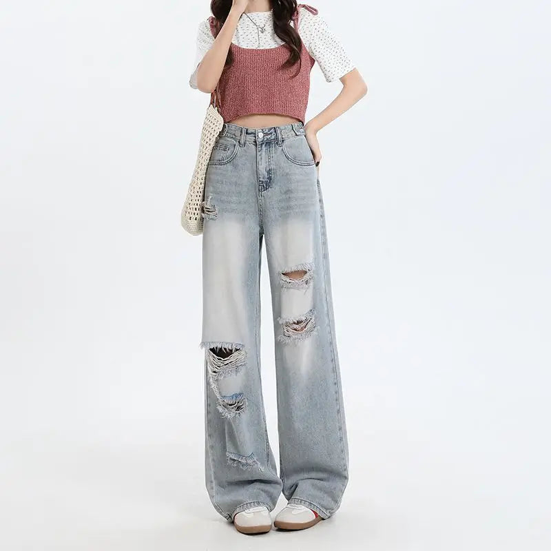 سراويل محب عالية الشارع ممزقة جينز التوابل الأمريكية رقيقة مادة سراويل الساق واسعة تطول