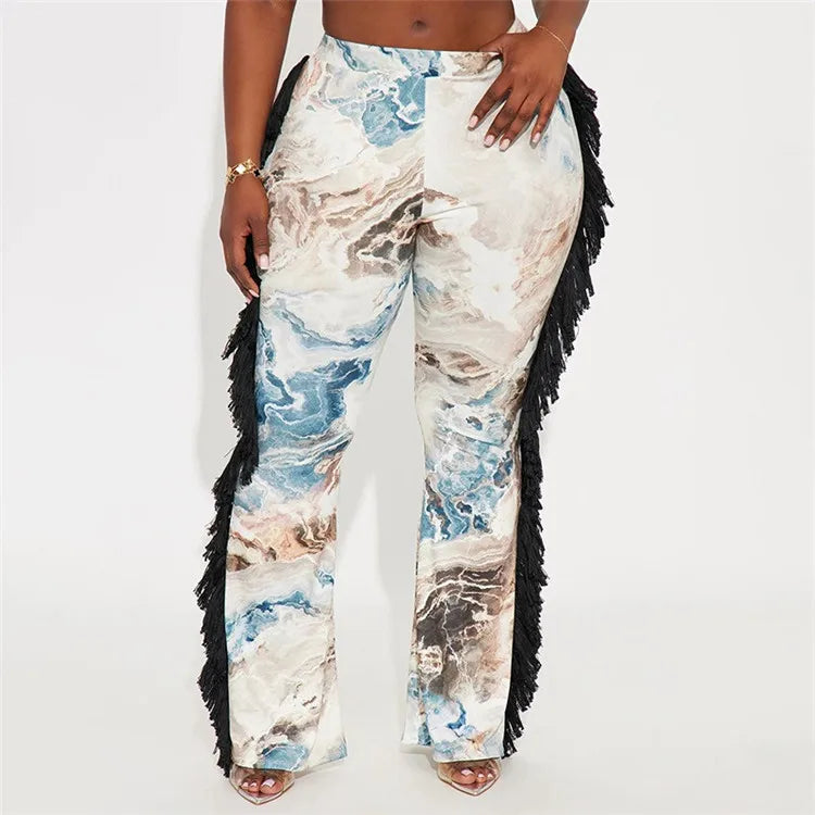 سراويل نسائية أنيقة مطبوعة بشراشيب جانبية مضيئة للشارع والخريف