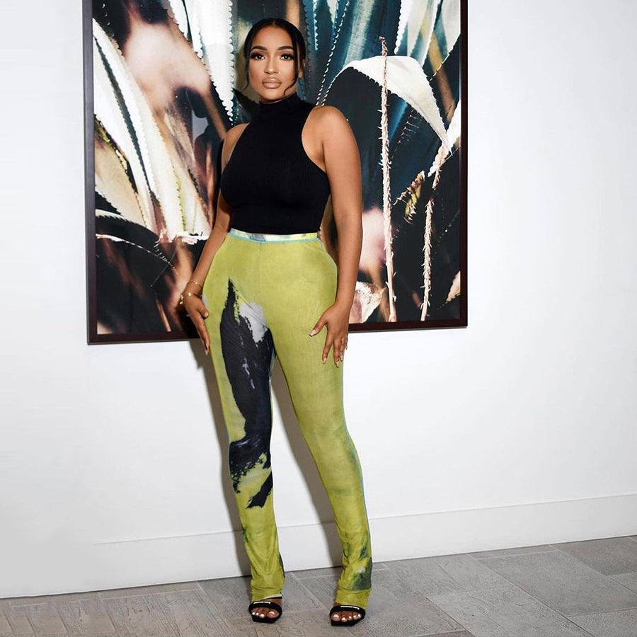 بنطلون شبكي مطبوع بتقنية التاي داي 15895، سروال واسع شفاف للحفلات المسائية والنوادي الليلية، بنطلون ضيق للنساء