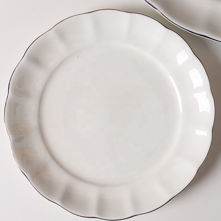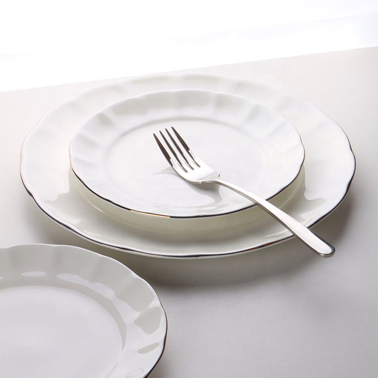 تصميم جديد 2 أطباق صينية عظمية بيضاء سيراميك حافة ذهبية مستديرة عشاء بورسلين ناعم