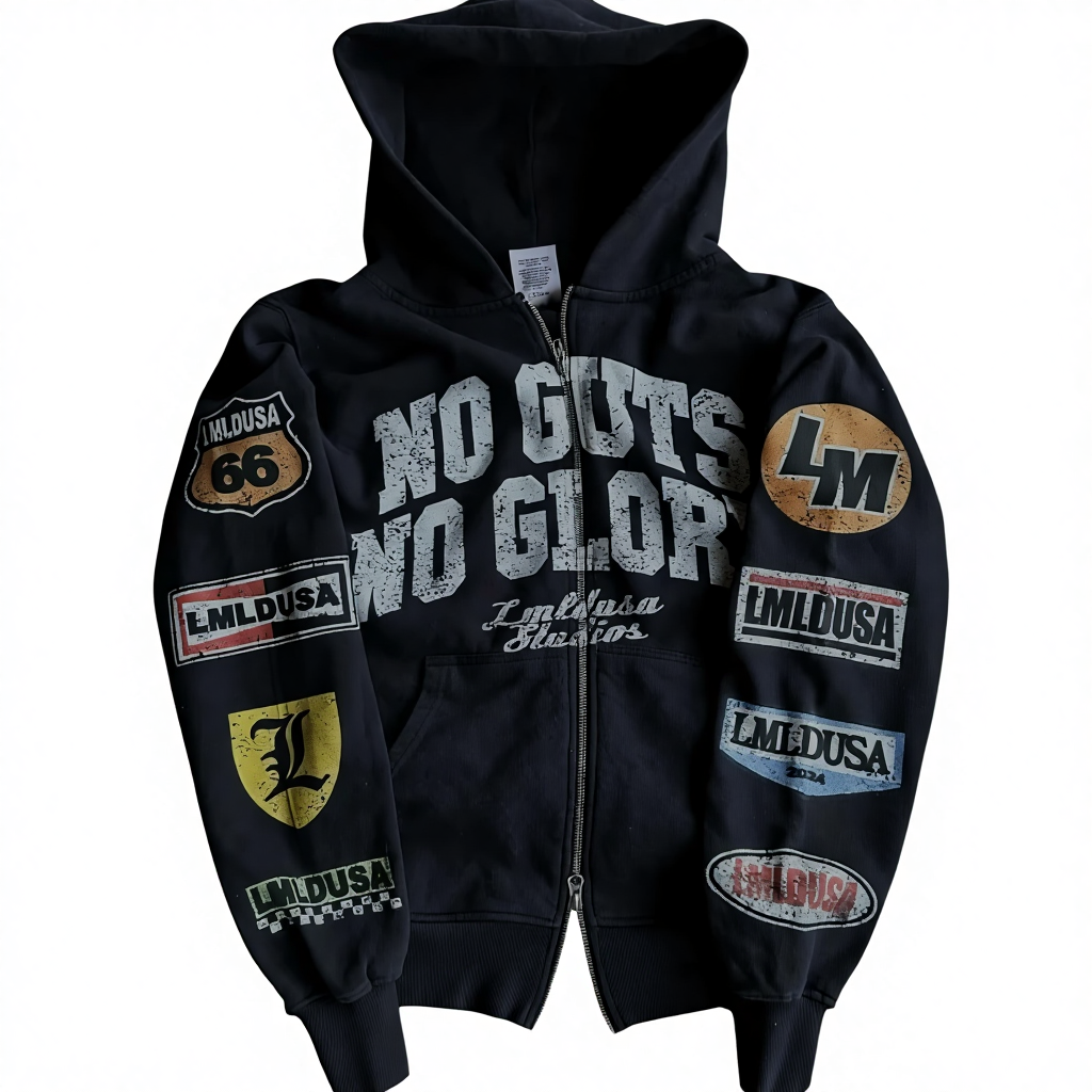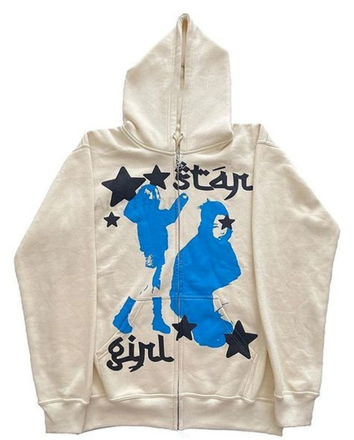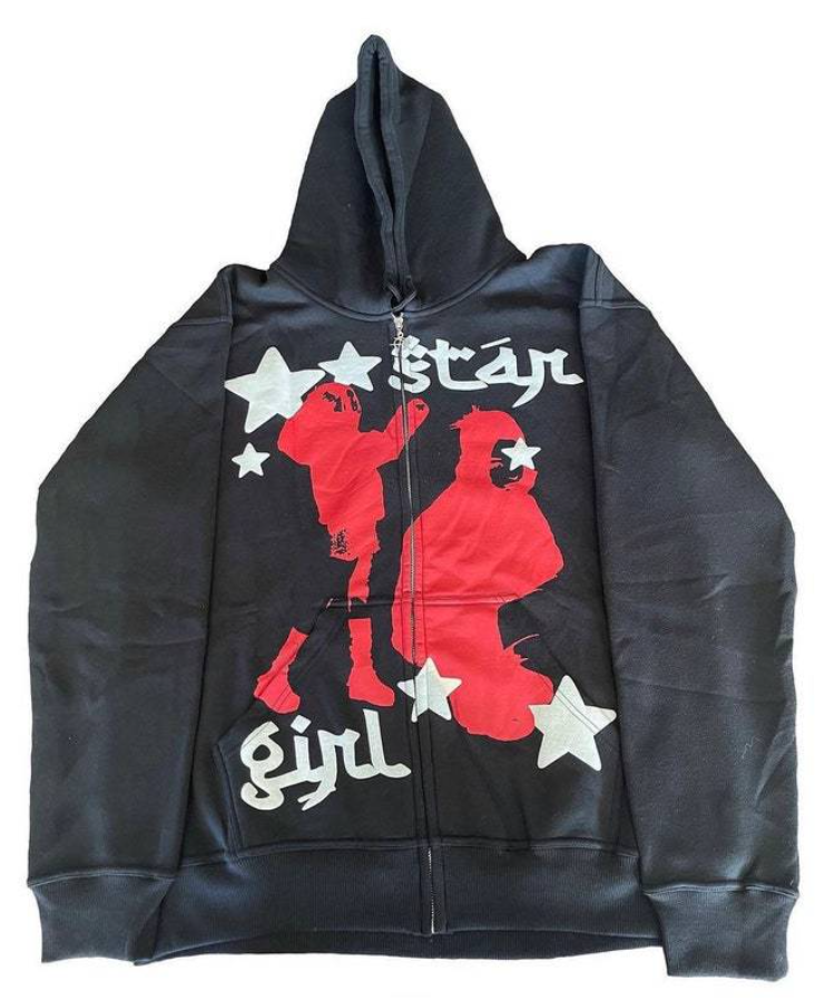 سترة نسائية بقلنسوة وأكمام طويلة بسحاب أسود، مطبوعة بتقنية النقل الحراري